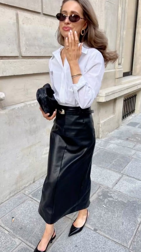 Το τέλειο outfit με φούστα για το γραφείο, για μια επαγγελματική συνάντηση ή για μια επαγγελματική έκθεση είναι μια midi δερμάτινη φούστα συνδυασμένη με ένα πουκάμισο. Για το φθινόπωρο προτίμησε μια μαύρη, μπορντό ή καφέ δερμάτινη φούστα και συνδύασέ την με ένα λευκό πουκάμισο. Τίποτα δε μπορεί να πάει στραβά με αυτό τον συνδυασμό!