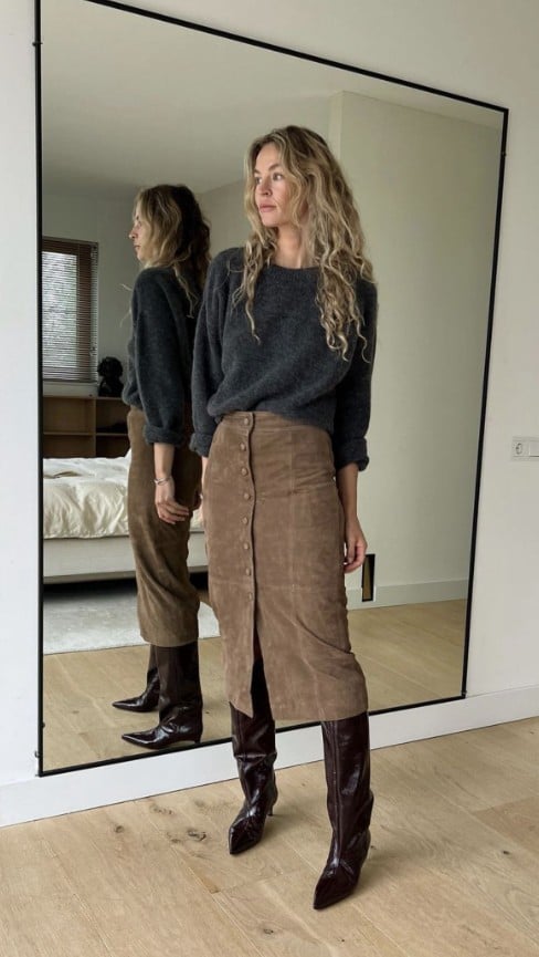 Suede φούστα με πουκάμισο ή πουλόβερ