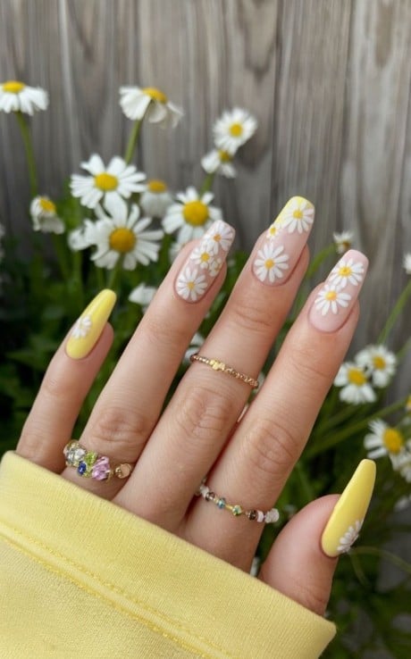 Τα λουλουδάτα σχέδια ταιριάζουν πολύ και στην άνοιξη. Ένα nail art που μπορείς να κάνεις από τώρα και να είσαι μέσα στην μόδα είναι το floral. Μια διαχρονική επιλογή που προσαρμόζεται με τις τάσεις της εποχής και δεν μας απογοήτευσε ποτέ. Το φωτεινό κίτρινο μαζί με χαριτωμένα λουλούδια θα κάνουν τα νύχια σου να φαίνονται σαν καμβάς. Στο τέλος δώσε λίγη λάμψη με ένα γυαλιστερό top coat ή ολοκλήρωσε με ένα ματ top coat. Πρόσθεσε glitter, στρας ή ακόμα και φύλλα χρυσού. Δες επίσης: 8 Εντυπωσιακά floral σχέδια για τα νύχια που αξίζει να δοκιμάσεις