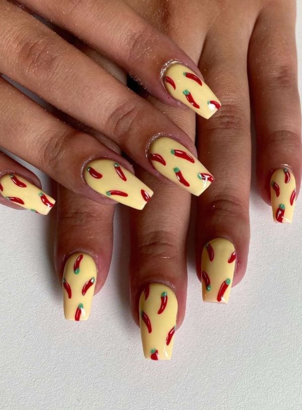 Αν θες ένα καλοκαιρινό και παιχνιδιάρικο σχέδιο οι chili πιπεριές είναι αυτό που ψάχνεις. Σε ένα από τα πιο hot χρώματα του καλοκαιριού αυτό το σχέδιο έρχεται για να εντυπωσιάσει. Η πικάντικη αυτή λεπτομέρεια δίνει τόλμη και στιλ που δεν περνάει απαρατήρητο. Για μια πιο minimal εκδοχή μπορείς να δοκιμάσεις μοτίβα με πιο μικρές και απλές chili πιπεριές. Ιδανικό για διακοπές ή ακόμα και για φεστιβάλ.